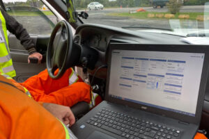 EQUIPAMENTOS – No caso da avaliação IRI foi utilizado veículo com o Perfilômetro Laser, um sistema de medição do perfil longitudinal de pavimento rodoviário, realizado com medidores de distância a laser, acelerômetros e um sistema preciso de medição de deslocamento/velocidade, gerenciados por um sistema micro processado, que coordena a aquisição dos dados e os envia a um computador portátil, em tempo real.