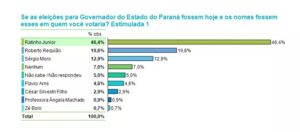 Enfim saiu um levantamento com Moro na disputa pelo Governo do Estado. Depois que o ex-juiz apareceu com destaque na corrida do Senado, alguns institutos aproveitaram para medir a popularidade do Moro contra Ratinho Junior e Roberto Requião. No cenário estimulado da pesquisa do IRG, Ratinho Jr (PSD) marca 46,4%, Requião tem 19,6% e Moro (União) aparece com 12,9%. O cenário também apresenta Flavio Arns com 4,6% e Cesar Silvestri com 2,9%. Com índice inferior a 1%, Professora Angela Machado marcou 0,9% e Zé Boni alcançou 0,7% de acordo com a pesquisa.