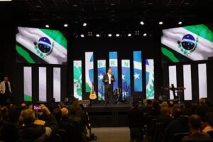 O governador Ratinho Junior participou nesta terça-feira (14) do Culto Núcleo de Pastores, evento promovido pela Igreja Alcance Curitiba. Durante o encontro, ele agradeceu o papel de acolhimento que as igrejas exercem, sobretudo aos mais carentes, e citou como exemplo a experiência do programa Cartão Comida Boa, que contou com a parceria das igrejas para orientação da população.