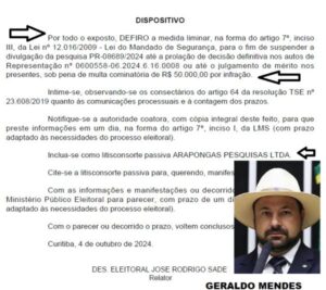 A Justiça Eleitoral concedeu uma decisão liminar nesta sexta-feira (04) que impugna a pesquisa eleitoral nº PR-02108/2024, registrada pela empresa ARAPONGAS PESQUISAS LTDA, sob suspeita de irregularidades graves. A pesquisa, utilizada pela campanha do candidato à prefeitura de São José dos Pinhais, Geraldo Mendes, apontava falsamente sua liderança nas intenções de voto. No entanto, a decisão foi fundamentada em falhas no registro, como a ausência de um sistema interno de controle e conferência, além de inconsistências no questionário e nas respostas.